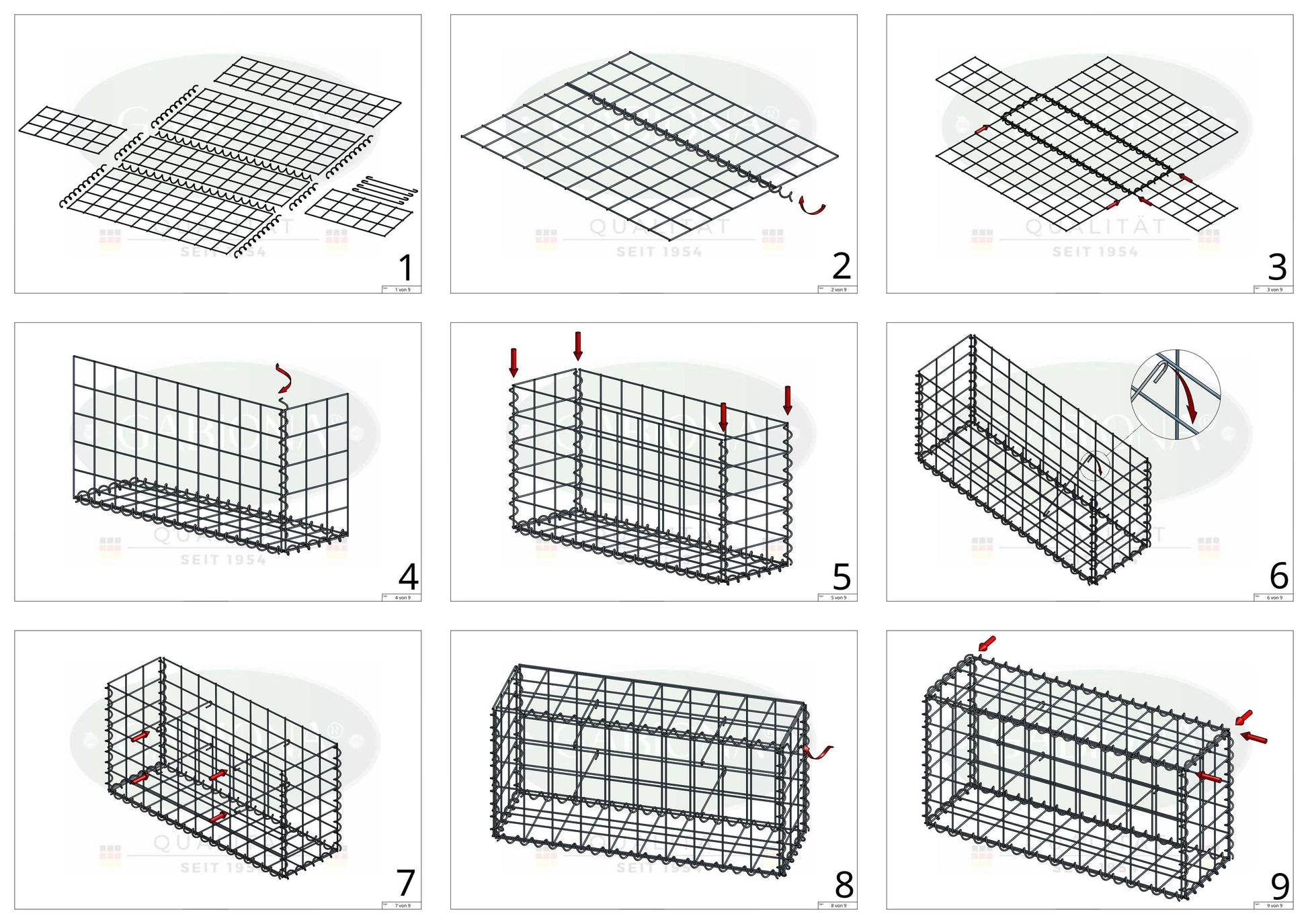Grâce au système de fermeture pratique, le montage de ton gabion s'effectue rapidement. Des entretoises adaptées empêchent de manière fiable tout bombement des grilles et assurent des lignes propres en permanence - pour un aspect stable et régulier.