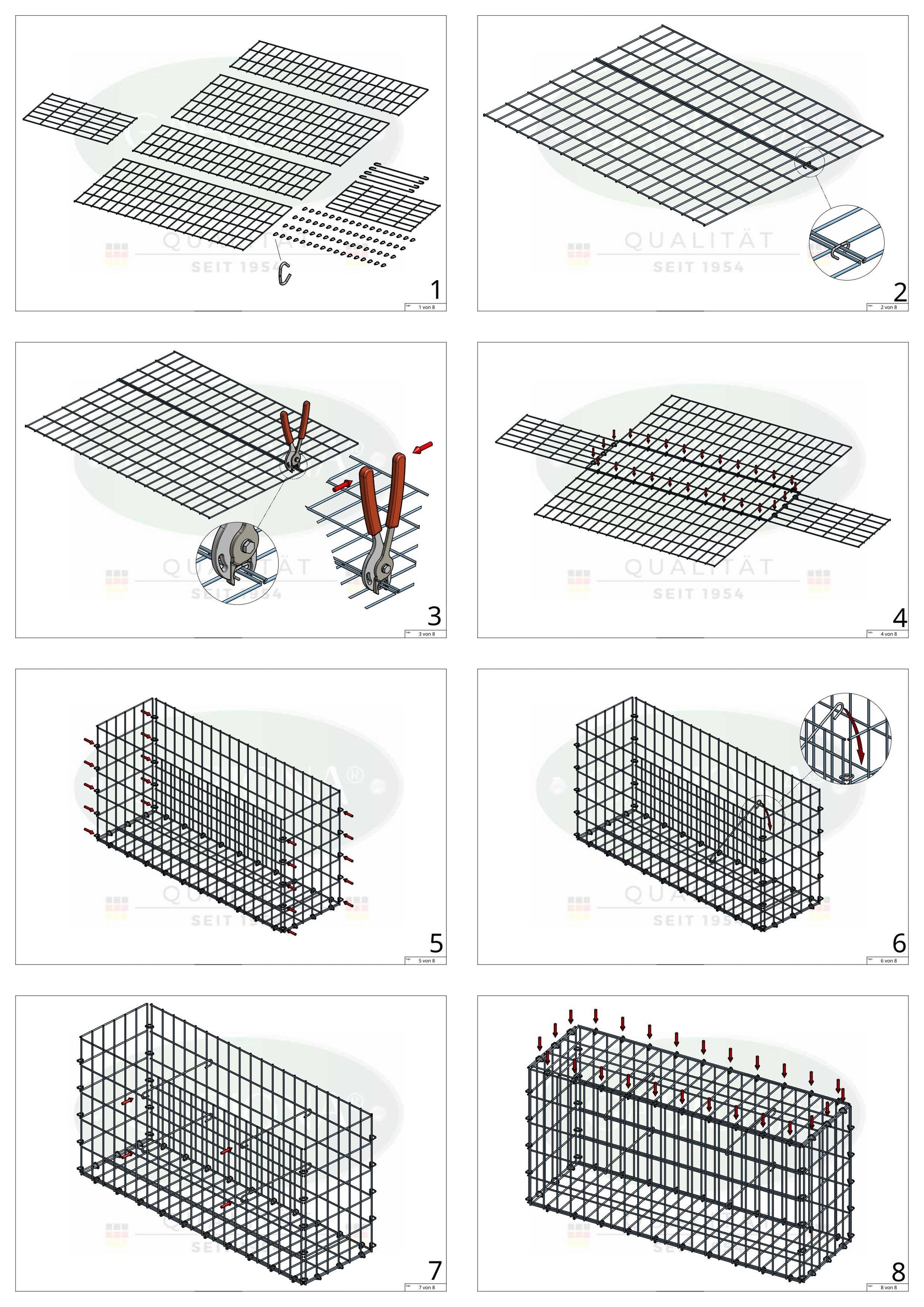 Grâce au système de fermeture pratique, le montage de ton gabion s'effectue rapidement. Des entretoises adaptées empêchent de manière fiable tout bombement des grilles et assurent des lignes propres en permanence - pour un aspect stable et régulier.