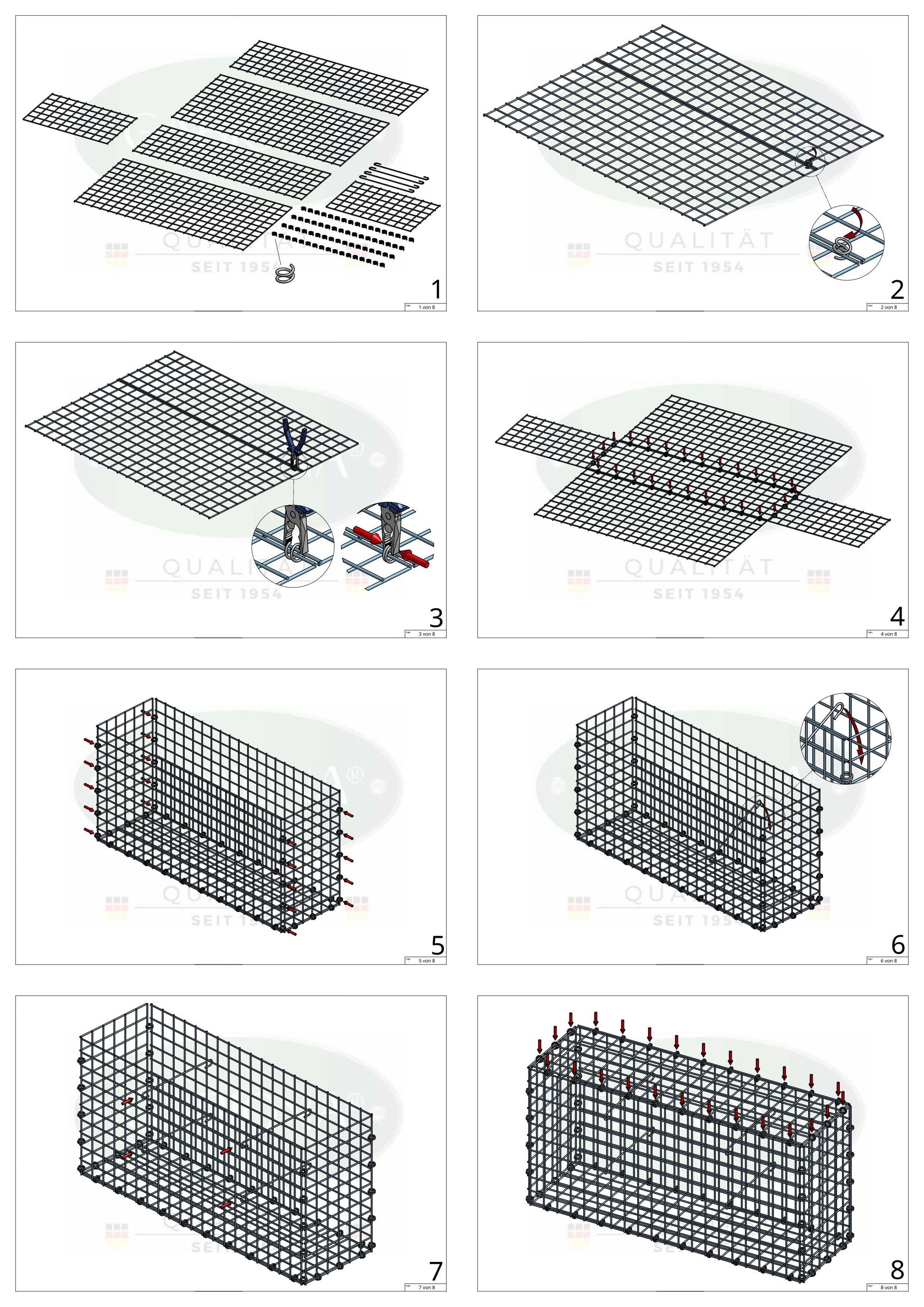 Diese robuste Gabione wurde speziell für höchste Ansprüche an Stabilität, Langlebigkeit und Witterungsbeständigkeit entwickelt. Die Konstruktion wird mit mehreren Spiralringen sicher verschlossen, die durch zwei Drähte gedreht und mithilfe einer Zange fixiert werden. Dies sorgt für eine einfache Montage und eine besonders stabile Verbindung der Gitter.